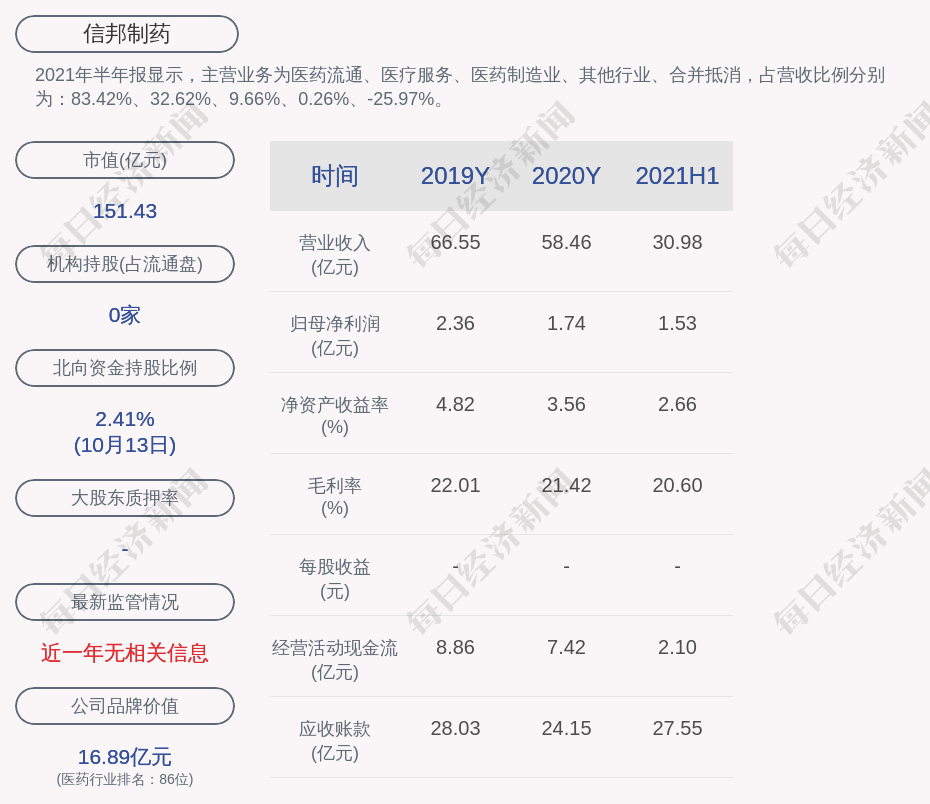 2021年半年报显示,信邦制药的主营业务为医药流通、医疗服务、医药制造业、其他行业、合并抵消,占营收比例分别为:83.42%、32.62%、9.66%、0.26%、-25.97%。