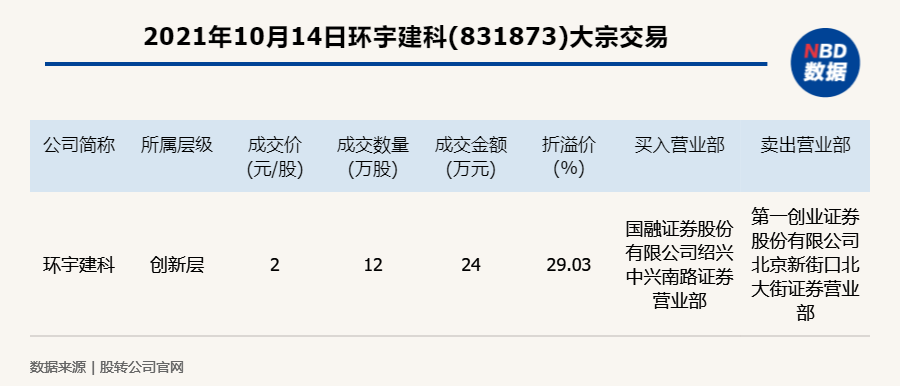 每经AI快讯,2021年10月14日,新三板创新层公司环宇建科(831873)发生一笔大宗交易,成交价2元/股,成交数量12万股,成交金额24万元,溢价29.03%。买入营业部是国融证券股份有限公司绍兴中兴南路证券营业部,卖出营业部是第一创业证券股份有限公司北京新街口北大街证券营业部。