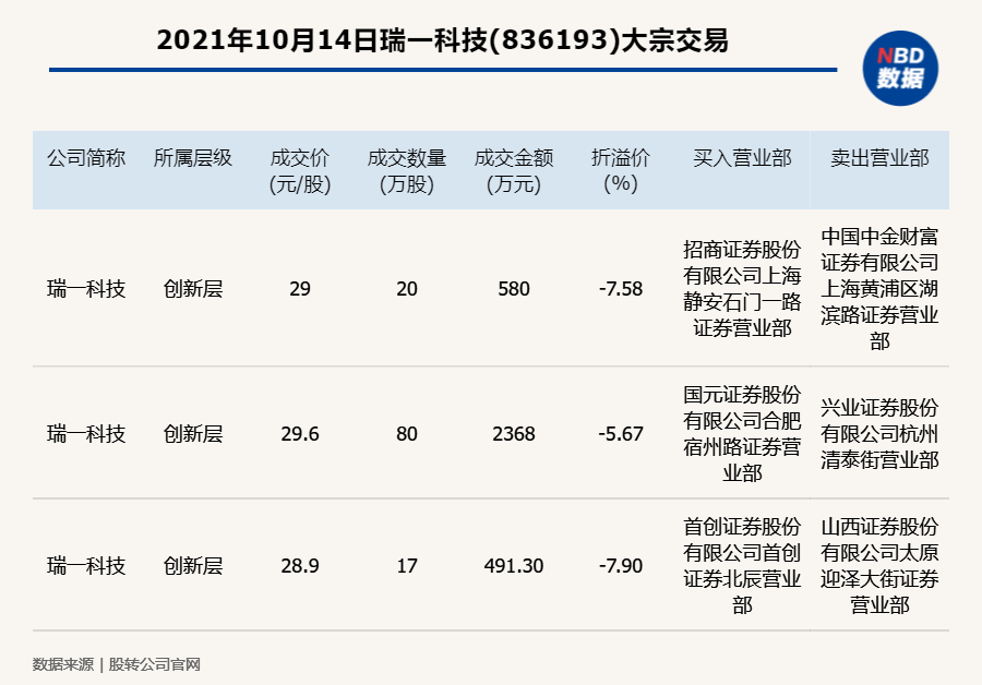 每经AI快讯,2021年10月14日,新三板创新层公司瑞一科技(836193)发生3笔大宗交易,总成交金额为3439.30万元,成交金额最高的一笔成交价29.6元/股,成交数量80万股,成交金额2368万元,折价5.67%。买入营业部是国元证券股份有限公司合肥宿州路证券营业部,卖出营业部是兴业证券股份有限公司杭州清泰街营业部。
