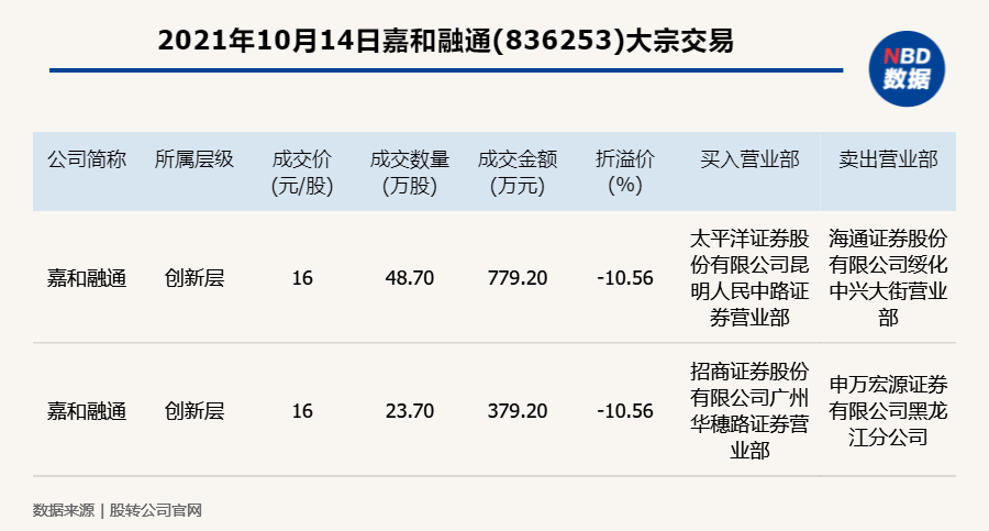 每经AI快讯,2021年10月14日,新三板创新层公司嘉和融通(836253)发生2笔大宗交易,总成交金额为1158.40万元,成交金额最高的一笔成交价16元/股,成交数量48.70万股,成交金额779.20万元,折价10.56%。买入营业部是太平洋证券股份有限公司昆明人民中路证券营业部,卖出营业部是海通证券股份有限公司绥化中兴大街营业部。