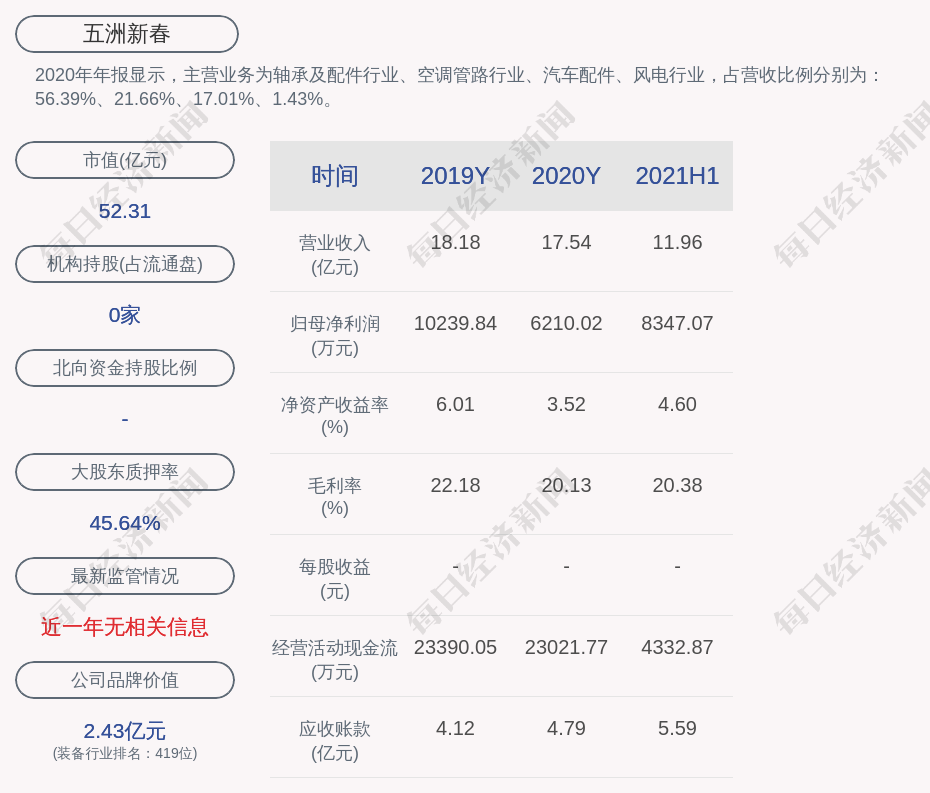 2020年年报显示,五洲新春的主营业务为轴承及配件行业、空调管路行业、汽车配件、风电行业,占营收比例分别为:56.39%、21.66%、17.01%、1.43%。