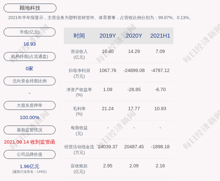 2021年半年报显示,顾地科技的主营业务为塑料管材管件、体育赛事,占营收比例分别为:99.87%、0.13%。
