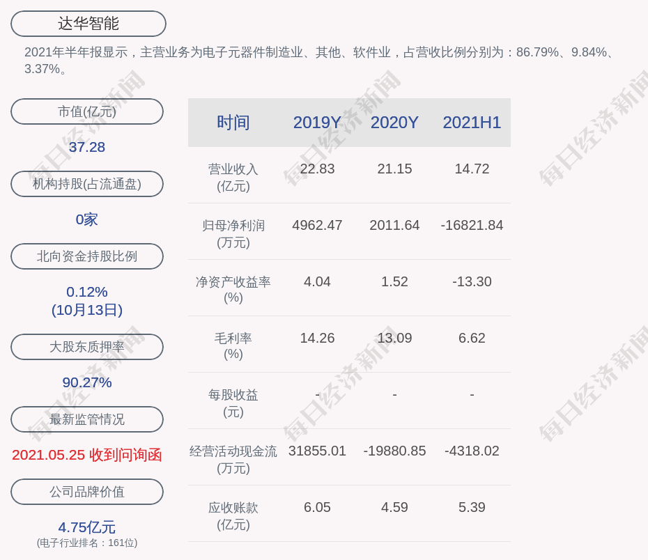 2021年半年报显示,达华智能的主营业务为电子元器件制造业、其他、软件业,占营收比例分别为:86.79%、9.84%、3.37%。
