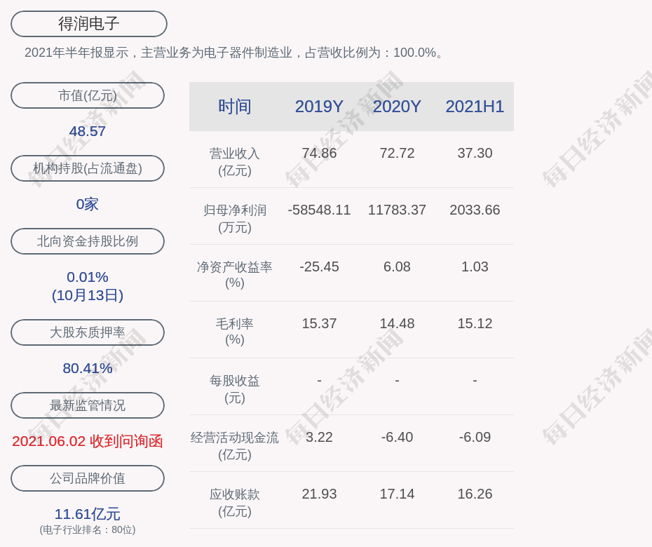 2021年半年报显示,得润电子的主营业务为电子器件制造业,占营收比例为:100.0%。