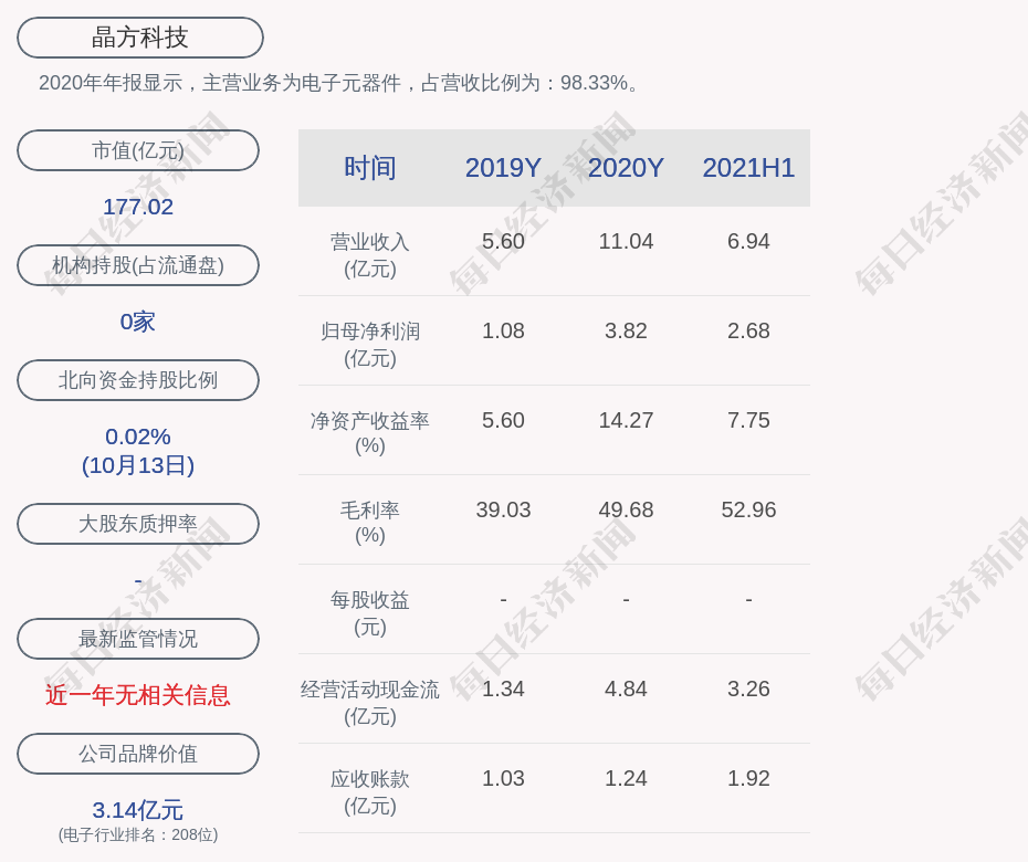 2020年年报显示,晶方科技的主营业务为电子元器件,占营收比例为:98.33%。