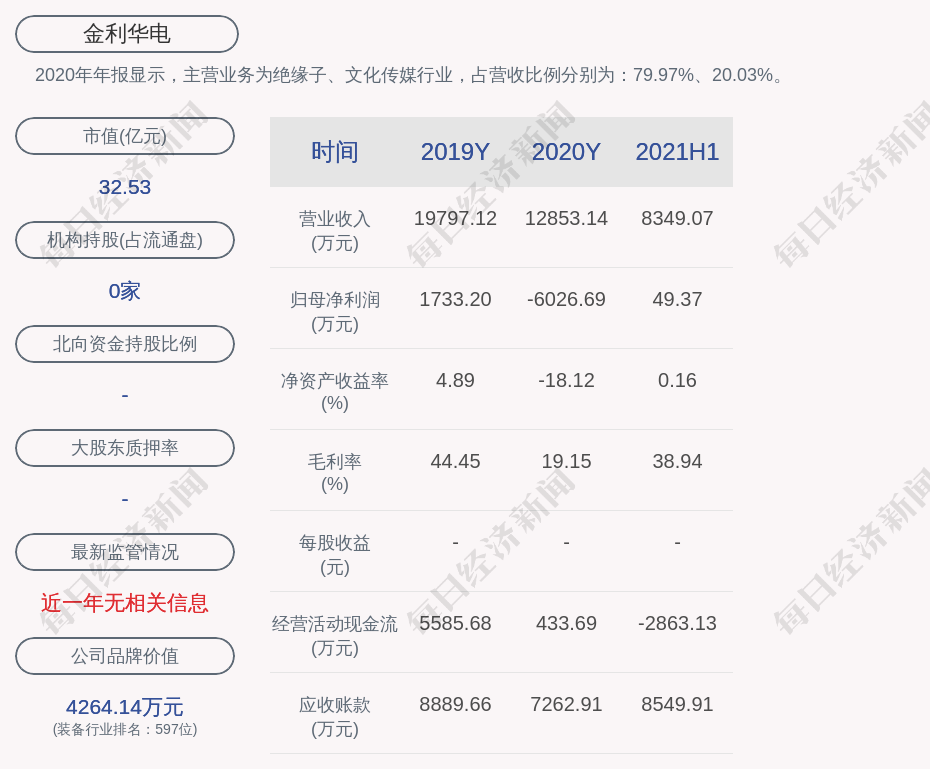 2020年年报显示,金利华电的主营业务为绝缘子、文化传媒行业,占营收比例分别为:79.97%、20.03%。
