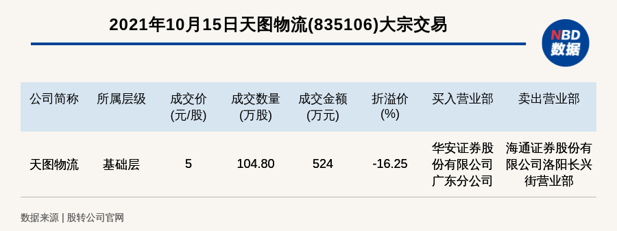 每经AI快讯,2021年10月15日,新三板基础层公司天图物流(835106)发生一笔大宗交易,成交价5元/股,成交数量104.80万股,成交金额524万元,折价16.25%。买入营业部是华安证券股份有限公司广东分公司,卖出营业部是海通证券股份有限公司洛阳长兴街营业部。