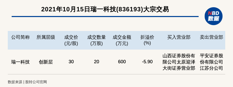 每经AI快讯,2021年10月15日,新三板创新层公司瑞一科技(836193)发生一笔大宗交易,成交价30元/股,成交数量20万股,成交金额600万元,折价5.9%。买入营业部是山西证券股份有限公司太原迎泽大街证券营业部,卖出营业部是平安证券股份有限公司江苏分公司。