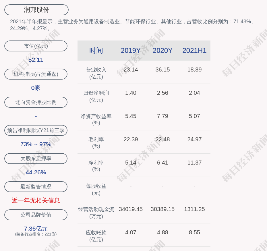 2021年半年报显示,润邦股份的主营业务为通用设备制造业、节能环保行业、其他行业,占营收比例分别为:71.43%、24.29%、4.27%。