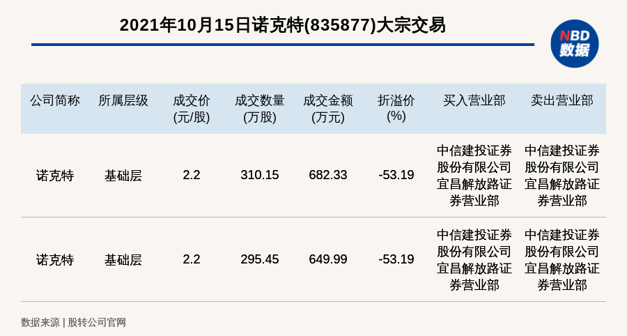每经AI快讯,2021年10月15日,新三板基础层公司诺克特(835877)发生2笔大宗交易,折价率最高的一笔成交价2.2元/股,成交数量310.15万股,成交金额682.33万元,折价53.19%。买入营业部是中信建投证券股份有限公司宜昌解放路证券营业部,卖出营业部是中信建投证券股份有限公司宜昌解放路证券营业部。