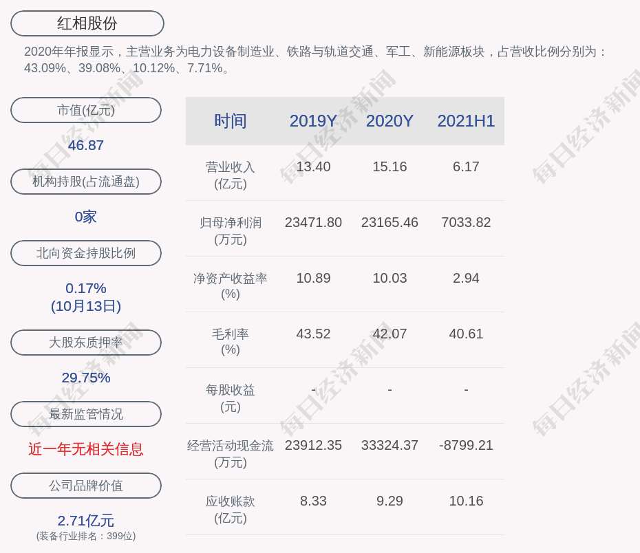 2020年年报显示,红相股份的主营业务为电力设备制造业、铁路与轨道交通、新能源板块等。