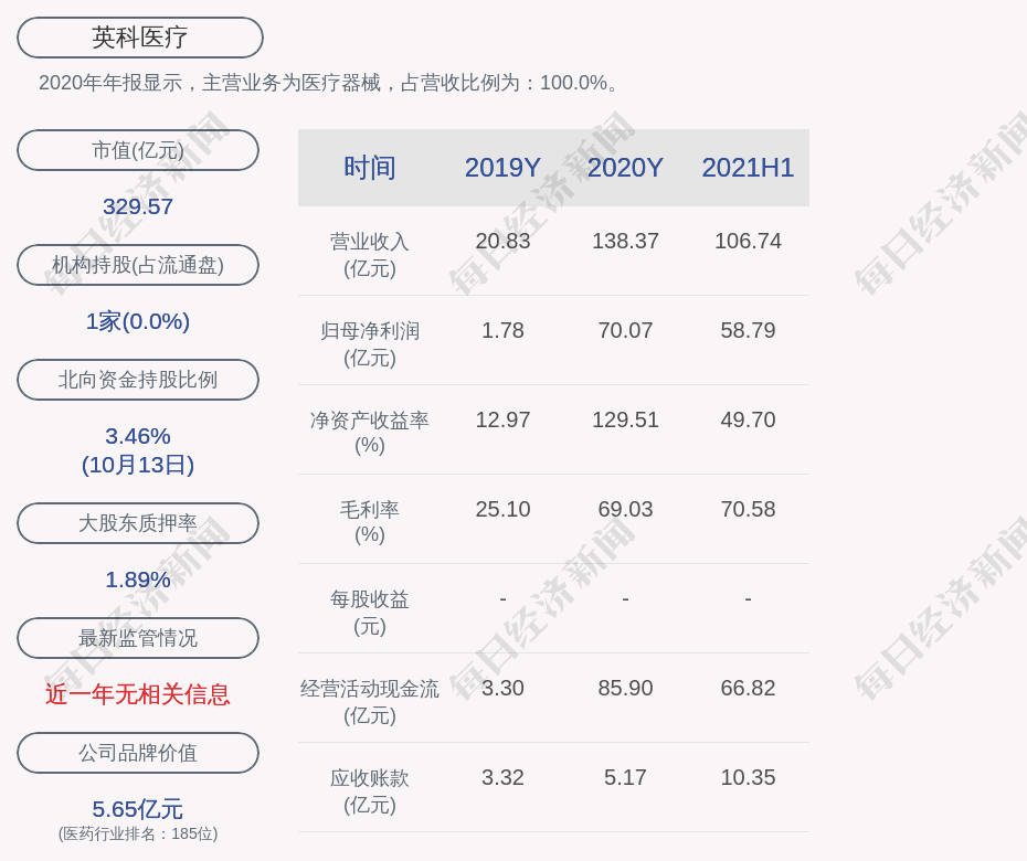 2020年年报显示,英科医疗的主营业务为医疗器械,占营收比例为:100.0%。