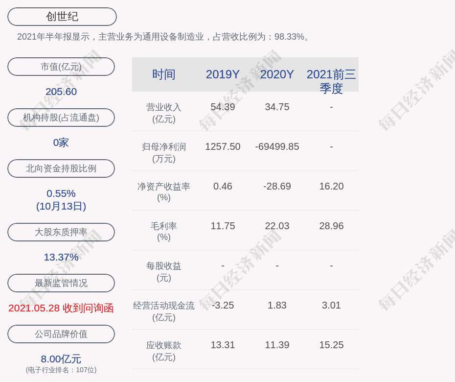 2021年半年报显示,创世纪的主营业务为通用设备制造业,占营收比例为:98.33%。
