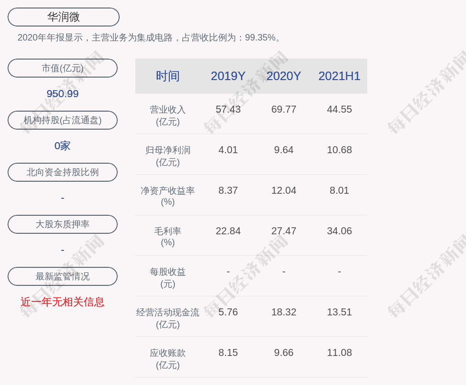 2020年年报显示,华润微的主营业务为集成电路,占营收比例为:99.35%。