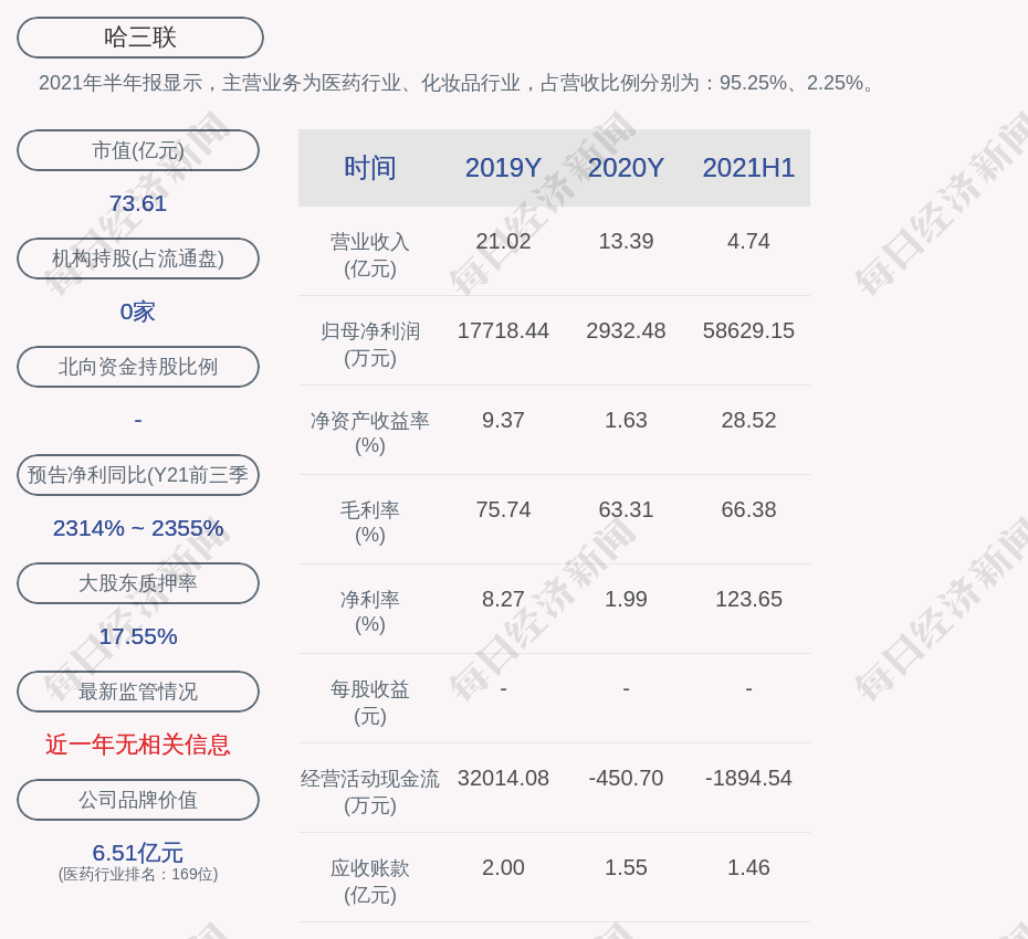 2021年半年报显示,哈三联的主营业务为医药行业、化妆品行业,占营收比例分别为:95.25%、2.25%。