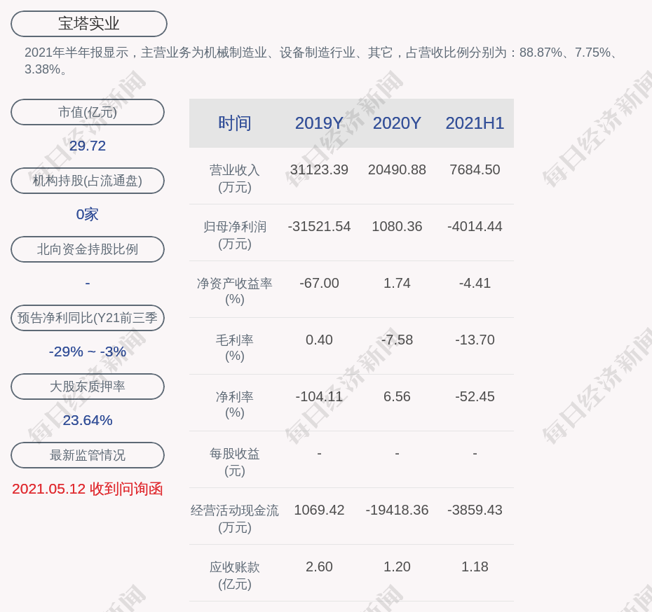 2021年半年报显示,宝塔实业的主营业务为机械制造业、设备制造行业、其它,占营收比例分别为:88.87%、7.75%、3.38%。