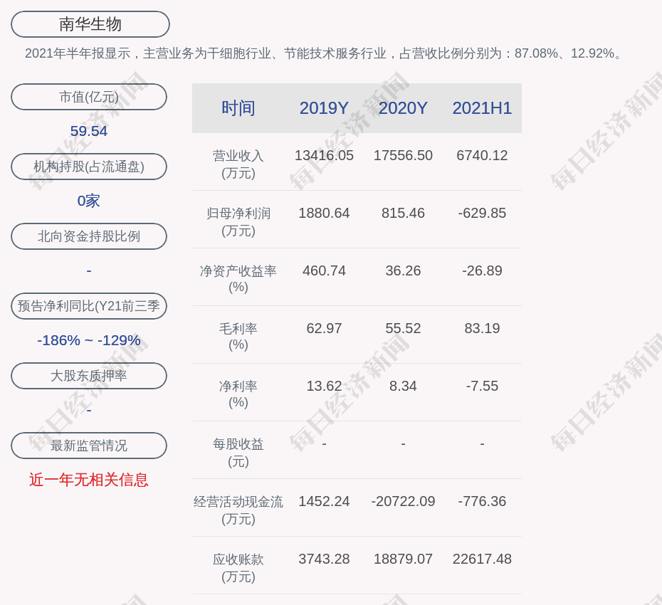 2021年半年报显示,南华生物的主营业务为干细胞行业、节能技术服务行业,占营收比例分别为:87.08%、12.92%。
