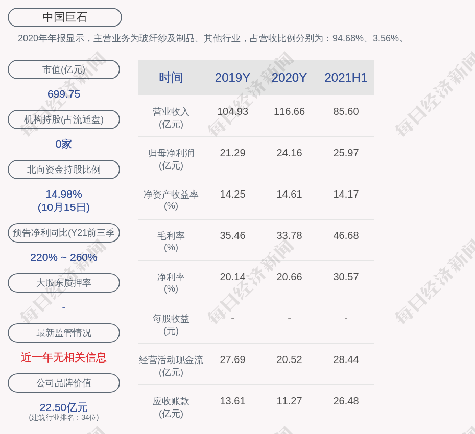2020年年报显示,中国巨石的主营业务为玻纤纱及制品、其他行业,占营收比例分别为:94.68%、3.56%。
