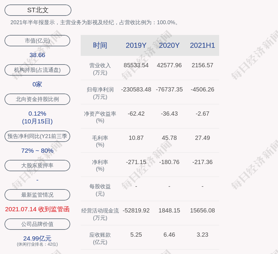 2021年半年报显示,ST北文的主营业务为影视及经纪,占营收比例为:100.0%。