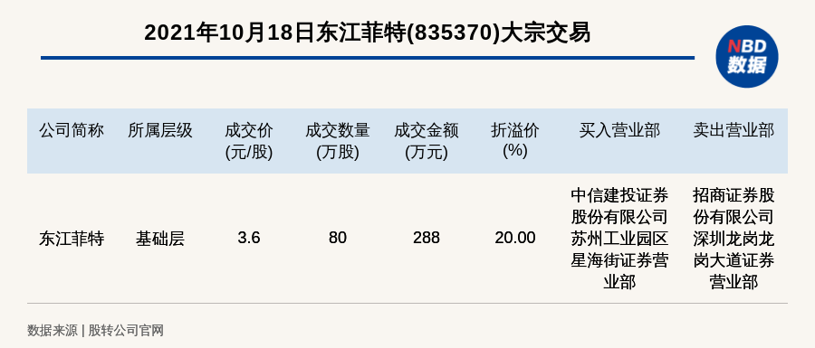 每经AI快讯,2021年10月18日,新三板基础层公司东江菲特(835370)发生一笔大宗交易,成交价3.6元/股,成交数量80万股,成交金额288万元,溢价20%。买入营业部是中信建投证券股份有限公司苏州工业园区星海街证券营业部,卖出营业部是招商证券股份有限公司深圳龙岗龙岗大道证券营业部。