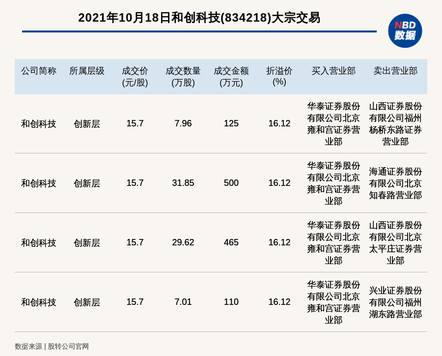每经AI快讯,2021年10月18日,新三板创新层公司和创科技(834218)发生4笔大宗交易,溢价率最高的一笔成交价15.7元/股,成交数量7.96万股,成交金额125万元,溢价16.12%。买入营业部是华泰证券股份有限公司北京雍和宫证券营业部,卖出营业部是山西证券股份有限公司福州杨桥东路证券营业部。