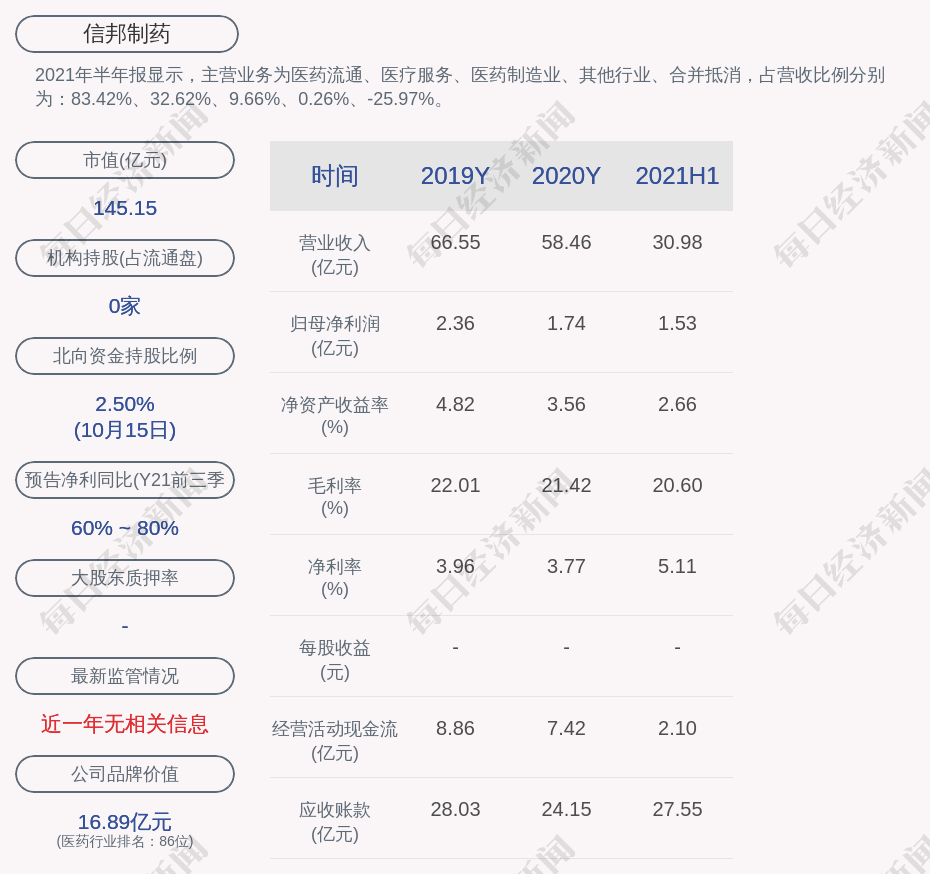 2021年半年报显示,信邦制药的主营业务为医药流通、医疗服务、医药制造业、其他行业、合并抵消,占营收比例分别为:83.42%、32.62%、9.66%、0.26%、-25.97%。