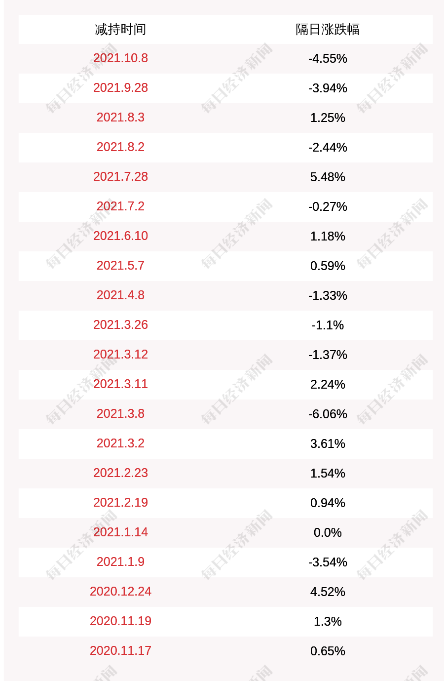3. 嘉泽新能上次发布减持公告是2021年10月08日,第二个交易日下跌4.55%,嘉泽新能近一年共发布22次减持类公告。更多关键信息,请搜索“道达号”。