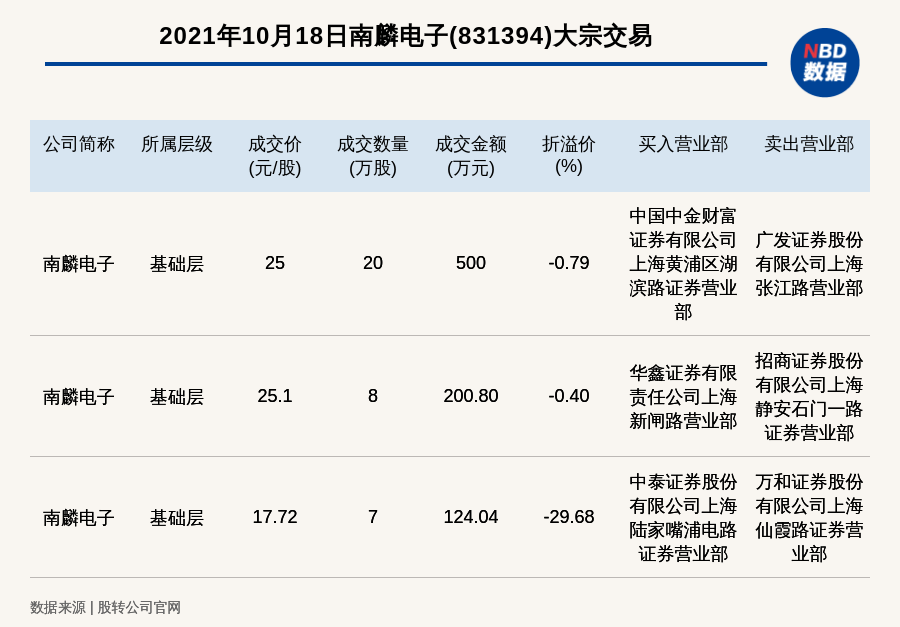 每经AI快讯,2021年10月18日,新三板基础层公司南麟电子(831394)发生3笔大宗交易,总成交金额为824.84万元,成交金额最高的一笔成交价25元/股,成交数量20万股,成交金额500万元,折价0.79%。买入营业部是中国中金财富证券有限公司上海黄浦区湖滨路证券营业部,卖出营业部是广发证券股份有限公司上海张江路营业部。