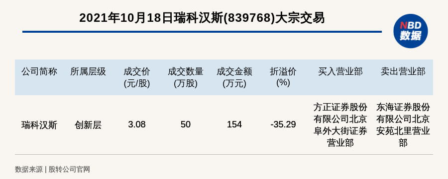 每经AI快讯,2021年10月18日,新三板创新层公司瑞科汉斯(839768)发生一笔大宗交易,成交价3.08元/股,成交数量50万股,成交金额154万元,折价35.29%。买入营业部是方正证券股份有限公司北京阜外大街证券营业部,卖出营业部是东海证券股份有限公司北京安苑北里营业部。