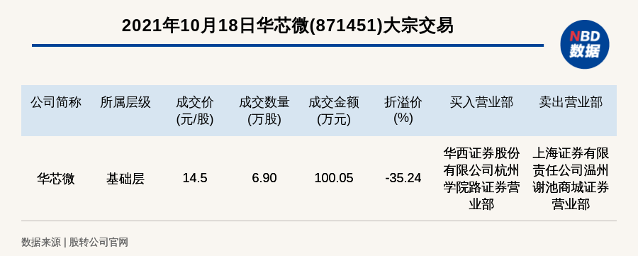 每经AI快讯,2021年10月18日,新三板基础层公司华芯微(871451)发生一笔大宗交易,成交价14.5元/股,成交数量6.90万股,成交金额100.05万元,折价35.24%。买入营业部是华西证券股份有限公司杭州学院路证券营业部,卖出营业部是上海证券有限责任公司温州谢池商城证券营业部。