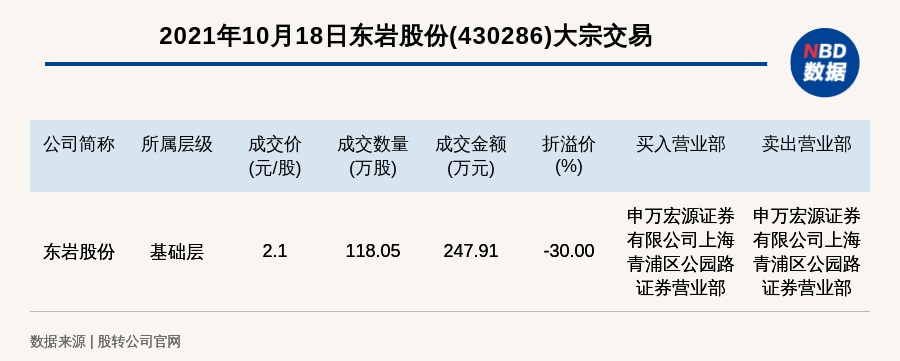 每经AI快讯,2021年10月18日,新三板基础层公司东岩股份(430286)发生一笔大宗交易,成交价2.1元/股,成交数量118.05万股,成交金额247.91万元,折价30%。买入营业部是申万宏源证券有限公司上海青浦区公园路证券营业部,卖出营业部是申万宏源证券有限公司上海青浦区公园路证券营业部。