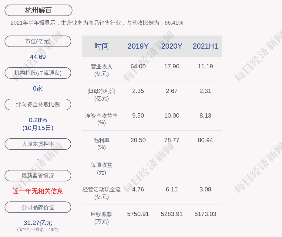 2021年半年报显示,杭州解百的主营业务为商品销售行业,占营收比例为:86.41%。