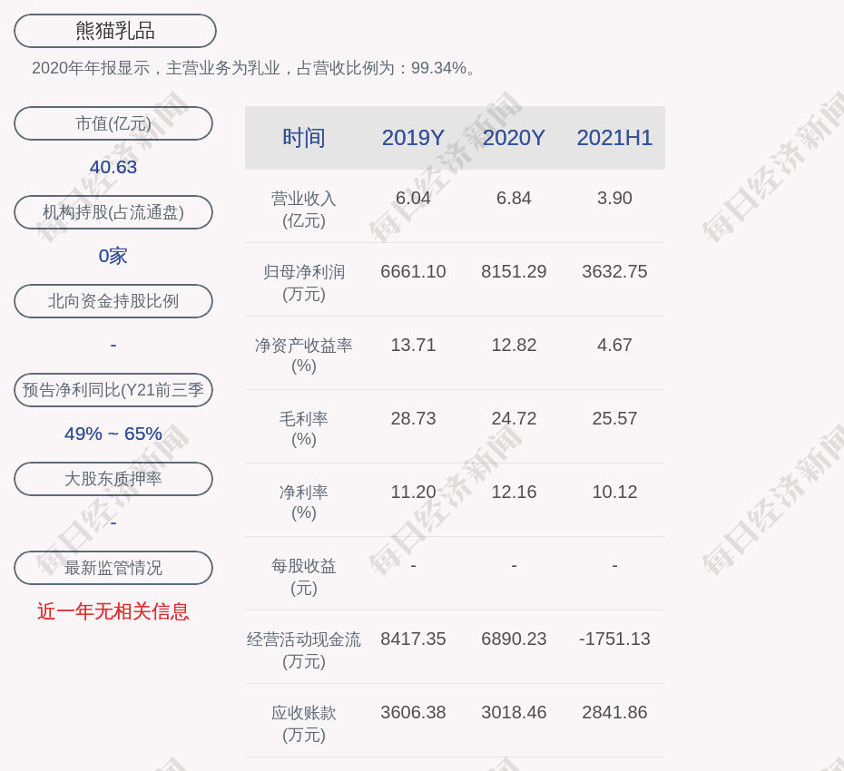 2020年年报显示,熊猫乳品的主营业务为乳业,占营收比例为:99.34%。