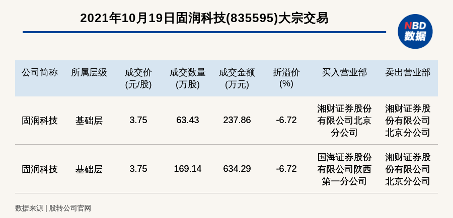 每经AI快讯,2021年10月19日,新三板基础层公司固润科技(835595)发生2笔大宗交易,总成交金额为872.14万元,成交金额最高的一笔成交价3.75元/股,成交数量169.14万股,成交金额634.29万元,折价6.72%。买入营业部是国海证券股份有限公司陕西第一分公司,卖出营业部是湘财证券股份有限公司北京分公司。