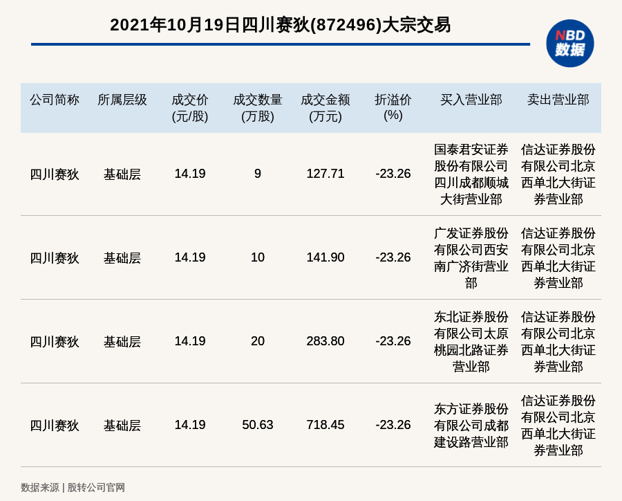 每经AI快讯,2021年10月19日,新三板基础层公司四川赛狄(872496)发生4笔大宗交易,总成交金额为1271.86万元,成交金额最高的一笔成交价14.19元/股,成交数量50.63万股,成交金额718.45万元,折价23.26%。买入营业部是东方证券股份有限公司成都建设路营业部,卖出营业部是信达证券股份有限公司北京西单北大街证券营业部。