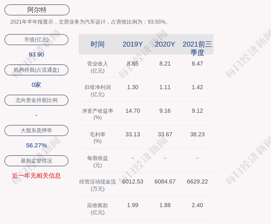 2021年半年报显示,阿尔特的主营业务为汽车设计,占营收比例为:93.55%。