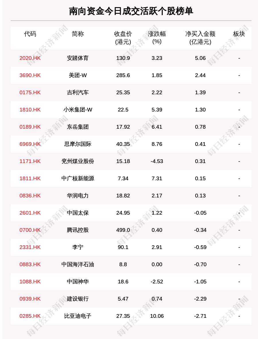 南向资金成交活跃个股榜单中,净买入个股共9只,金额最多的是安踏体育(2020.HK,收盘价:130.9港元),净买入5.057亿港元;净卖出个股共7只,金额最多的是比亚迪电子(0285.HK,收盘价:27.35港元),净卖出2.710亿港元。