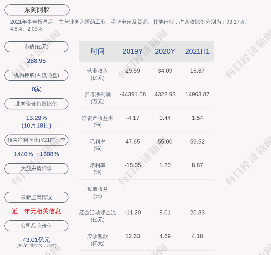 2021年半年报显示,东阿阿胶的主营业务为医药工业、毛驴养殖及贸易、其他行业,占营收比例分别为:93.17%、4.8%、2.03%。