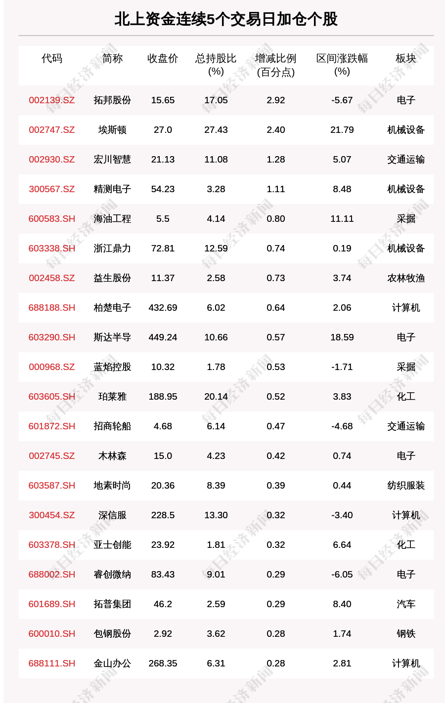 每经AI快讯,10月19日,北上资金连续5个交易日买入49个股。北上资金连续5个交易日加仓个股中,拓邦股份(002139.SZ,收盘价:15.65元)增持比例增幅最大,5个交易日增持2.92个百分点,其他增持比例较大的个股包括埃斯顿(002747.SZ,收盘价:27.0元)、宏川智慧(002930.SZ,收盘价:21.13元)、精测电子(300567.SZ,收盘价:54.23元),分别增持2.40个百分点、1.28个百分点、1.11个百分点。