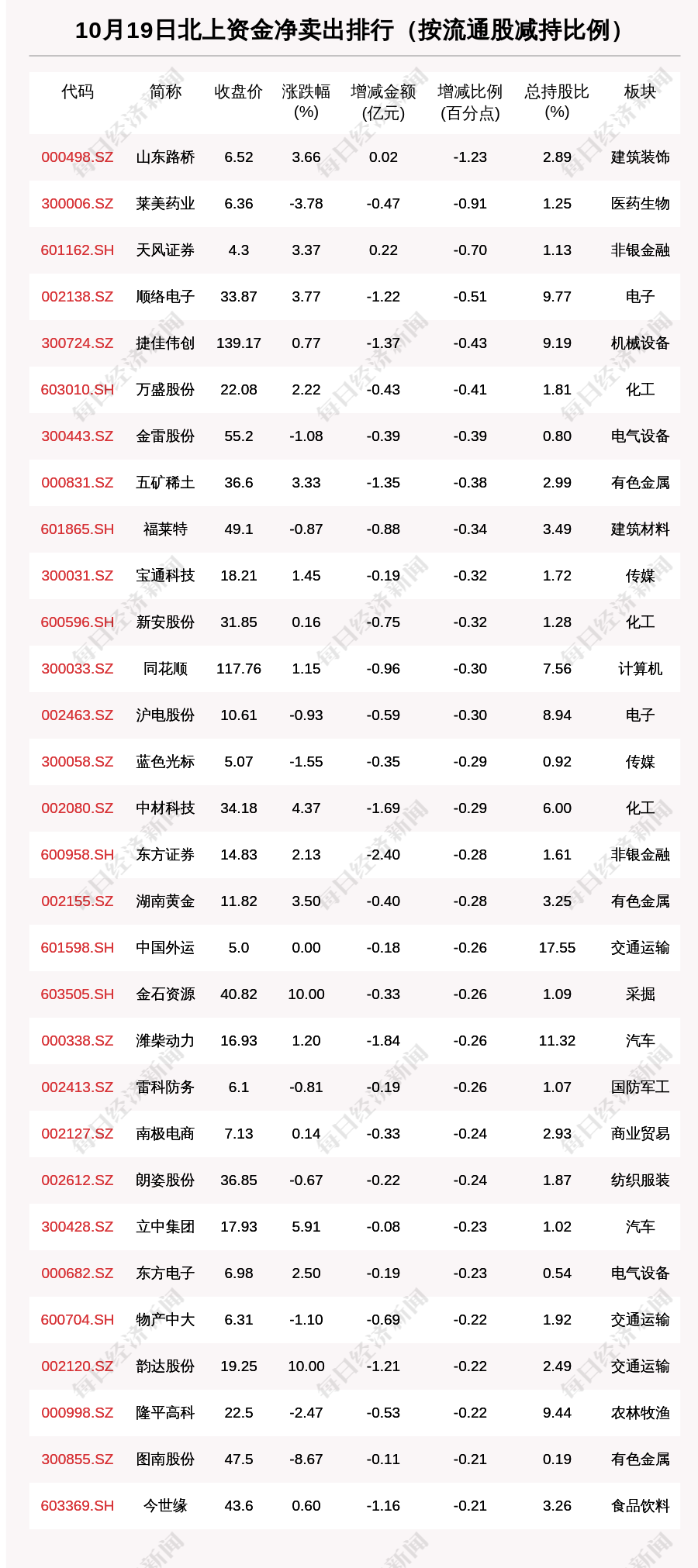 每经AI快讯,10月19日,北上资金净卖出的个股共有606只,北上资金减仓比例超1%的有457只。其中,山东路桥(000498.SZ,收盘价:6.52元)减仓比例最为明显,最新持股比例2.89%,环比减少1.23个百分点。其他北上资金减仓比例较多的个股还包括莱美药业(300006.SZ,收盘价:6.36元)、天风证券(601162.SH,收盘价:4.3元)、顺络电子(002138.SZ,收盘价:33.87元)。