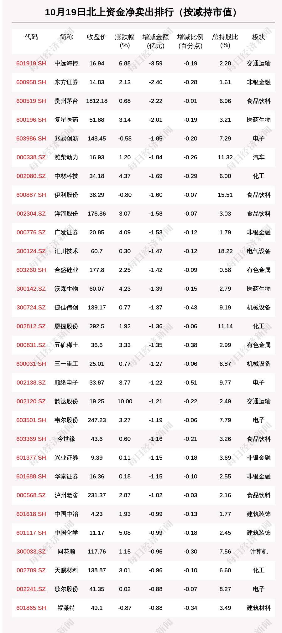 10月19日,按照北向资金减持市值排序,中远海控(601919.SH,收盘价:16.94元)减持市值最大,减持市值3.592亿元,环比减少8.12%。其他北上资金减持市值较多的个股还包括东方证券(600958.SH,收盘价:14.83元)、贵州茅台(600519.SH,收盘价:1812.18元)、复星医药(600196.SH,收盘价:51.88元)。