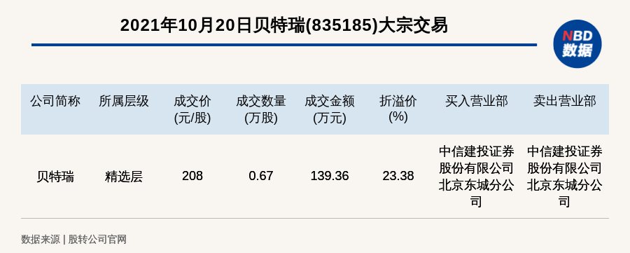 每经AI快讯,2021年10月20日,新三板精选层公司贝特瑞(835185)发生一笔大宗交易,成交价208元/股,成交数量0.67万股,成交金额139.36万元,溢价23.38%。买入营业部是中信建投证券股份有限公司北京东城分公司,卖出营业部是中信建投证券股份有限公司北京东城分公司。