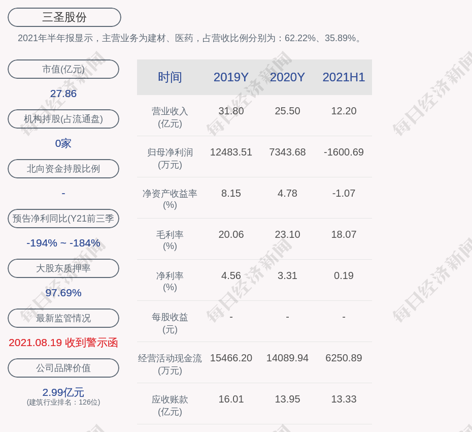 2021年半年报显示,三圣股份的主营业务为建材、医药,占营收比例分别为:62.22%、35.89%。