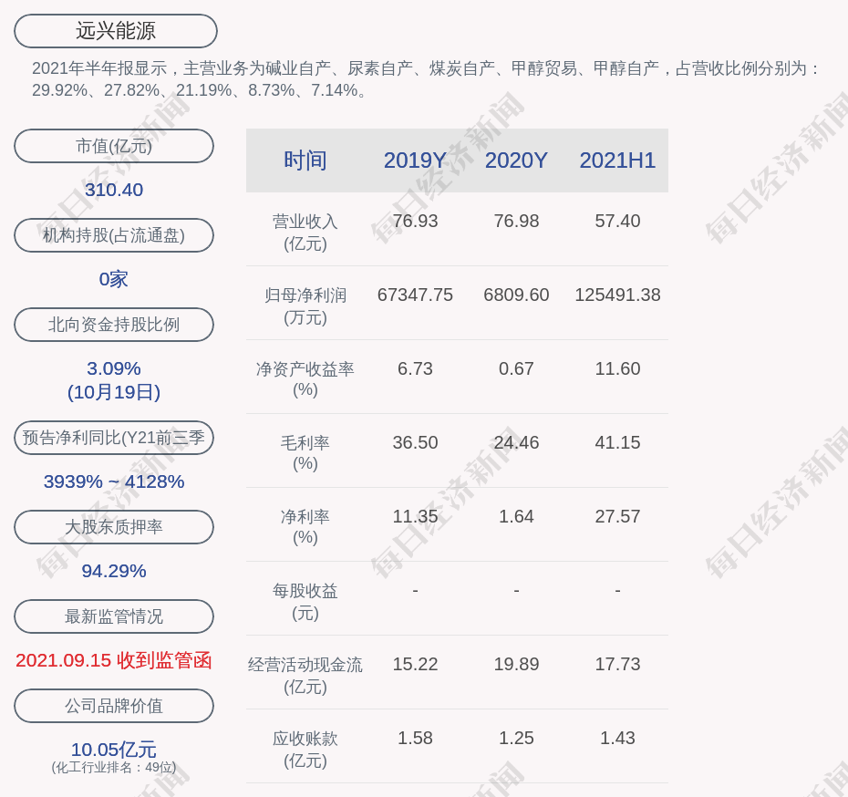 2021年半年报显示,远兴能源的主营业务为碱业自产、尿素自产、煤炭自产、甲醇贸易、甲醇自产,占营收比例分别为:29.92%、27.82%、21.19%、8.73%、7.14%。