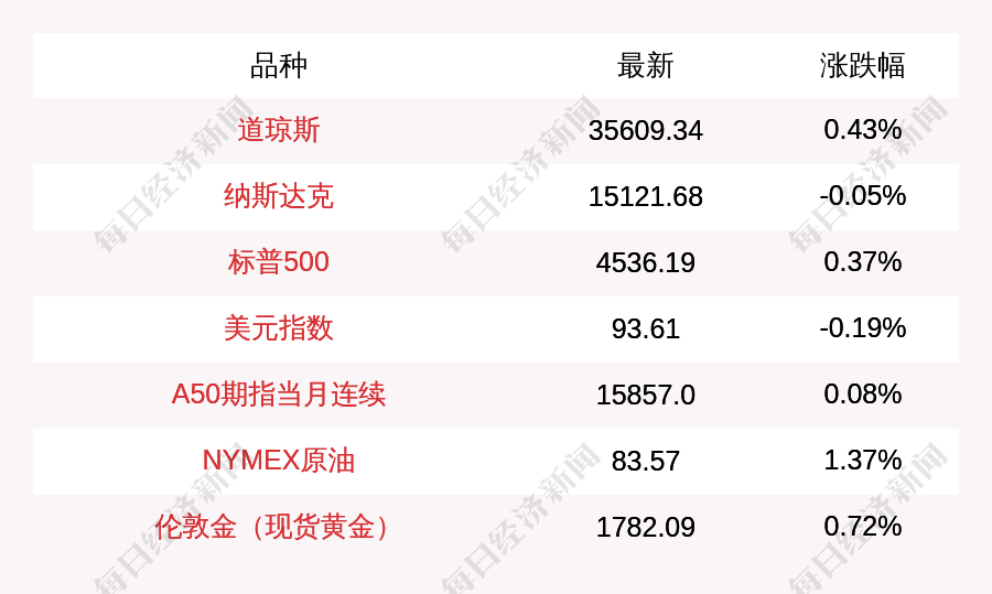 每经AI快讯:北京时间10月21日04:00,道琼斯收盘上涨152.03点,涨幅为0.43%,报35609.34点;纳斯达克收盘下跌7.41点,跌幅为0.05%,报15121.68点;标普500收盘上涨16.56点,涨幅为0.37%,报4536.19点;富时中国A50指数期货上涨13.0点,涨幅为0.08%,报15857.0点;NYMEX原油收盘上涨1.13点,涨幅为1.37%,报83.57点;美元指数收盘下跌0.18点,跌幅为0.19%,报93.61点;伦敦金(现货黄金)收盘上涨12.8点,涨幅为0.72%,报1782.09点。