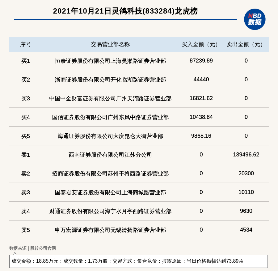 每经AI快讯,2021年10月21日,灵鸽科技(833284)登上龙虎榜,交易方式是集合竞价,披露原因是当日价格振幅达到73.89%,成交数量1.73万股,成交金额18.85万元。买一席位为恒泰证券股份有限公司上海吴淞路证券营业部,买入8.72万元;卖一席位为西南证券股份有限公司江苏分公司,卖出13.95万元。