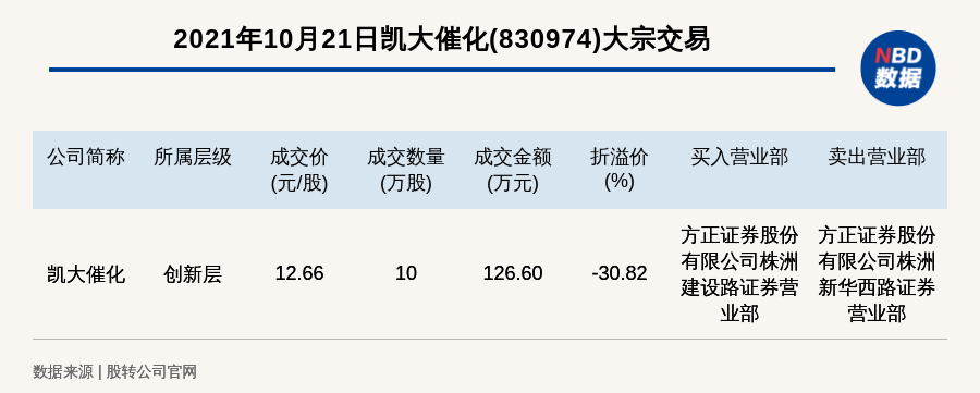每经AI快讯,2021年10月21日,新三板创新层公司凯大催化(830974)发生一笔大宗交易,成交价12.66元/股,成交数量10万股,成交金额126.60万元,折价30.82%。买入营业部是方正证券股份有限公司株洲建设路证券营业部,卖出营业部是方正证券股份有限公司株洲新华西路证券营业部。