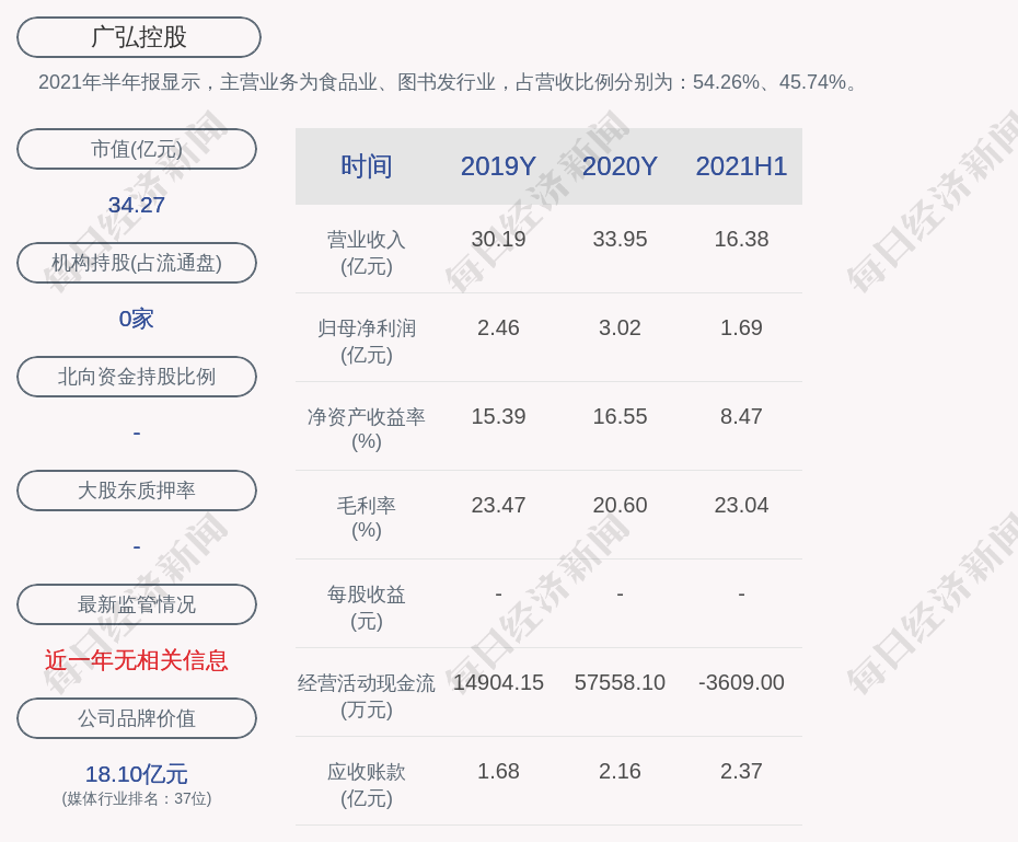 2021年半年报显示,广弘控股的主营业务为食品业、图书发行业,占营收比例分别为:54.26%、45.74%。