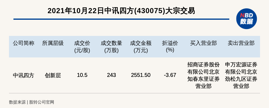 每经AI快讯,2021年10月22日,新三板创新层公司中讯四方(430075)发生一笔大宗交易,成交价10.5元/股,成交数量243万股,成交金额2551.50万元,折价3.67%。买入营业部是招商证券股份有限公司北京知春东里证券营业部,卖出营业部是申万宏源证券有限公司北京劲松九区证券营业部。