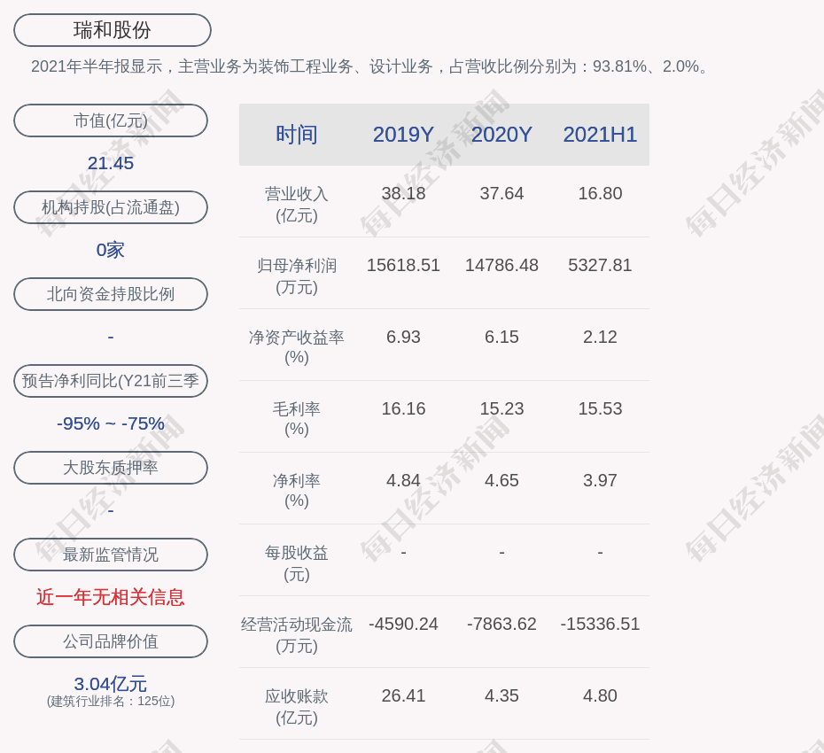 2021年半年报显示,瑞和股份的主营业务为装饰工程业务、设计业务,占营收比例分别为:93.81%、2.0%。